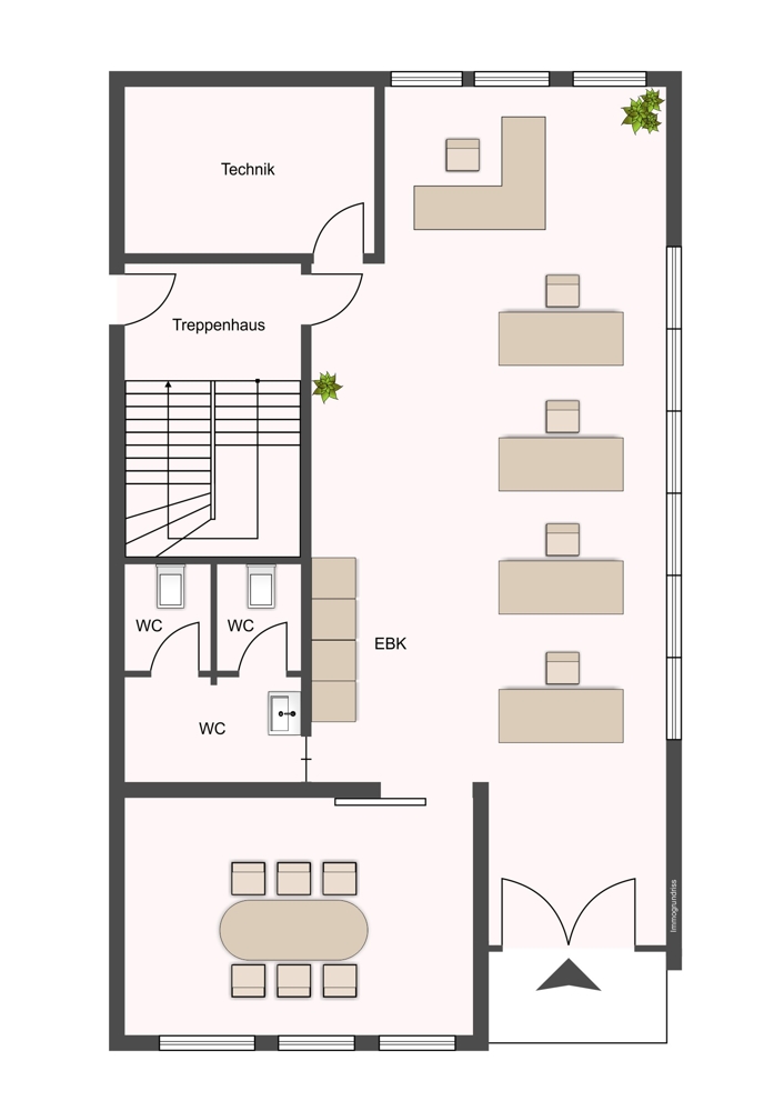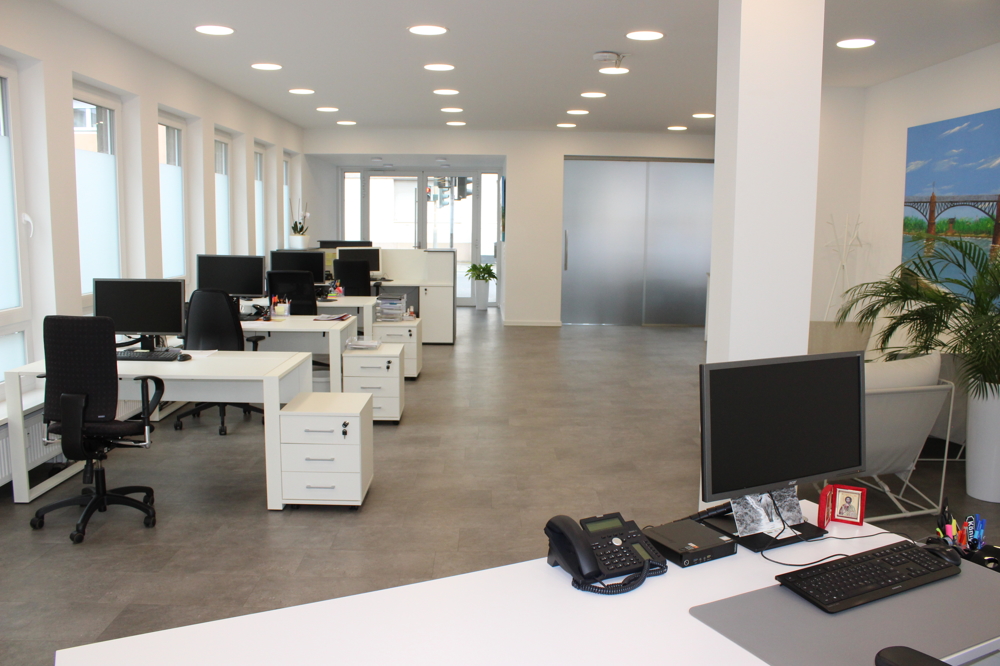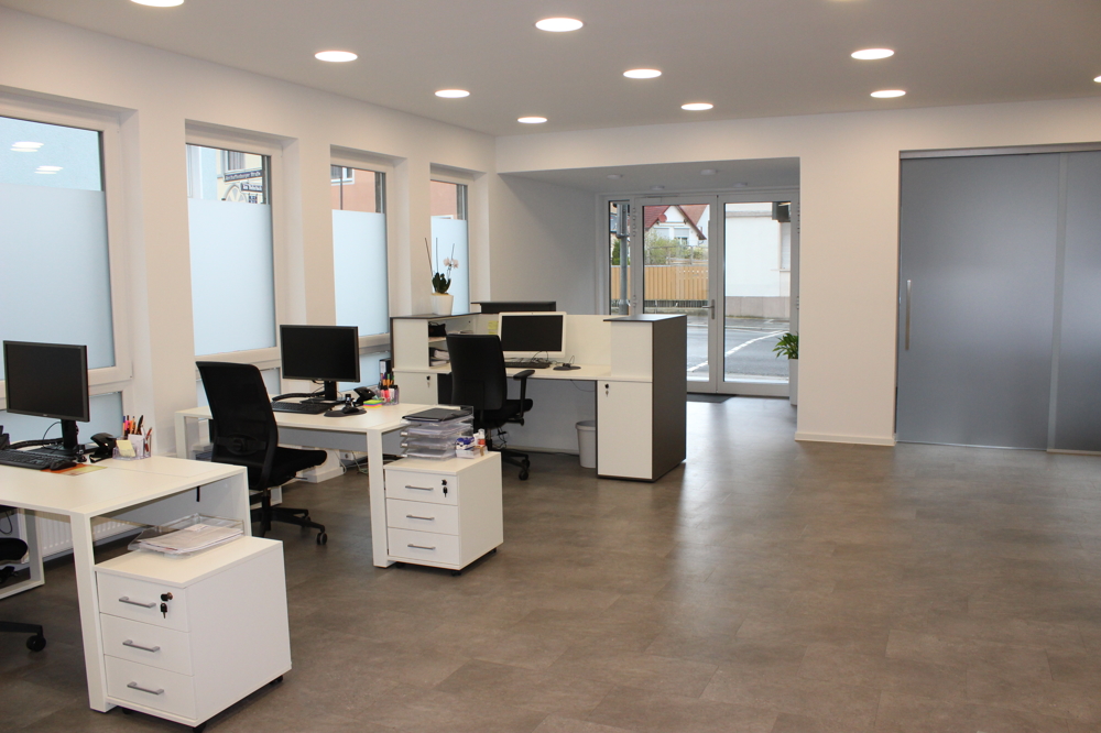 Durch die große Eingangstür gelangen Sie direkt in das lichtdurchflutete Büro. Derzeit wird die Gewerbefläche als reines Büro genutzt, was sich in der aktuellen Ausstattung widerspiegelt. Das Inventar des Büros umfasst eine Empfangstheke inkl. LED Beleuchtung, vier komplett eingerichtete Arbeitsplätze und mit Blick auf das gesamte Office, befindet sich im hinteren Teil ein großer Arbeitsplatz, welcher ideal durch die Geschäftsführung genutzt werden kann.