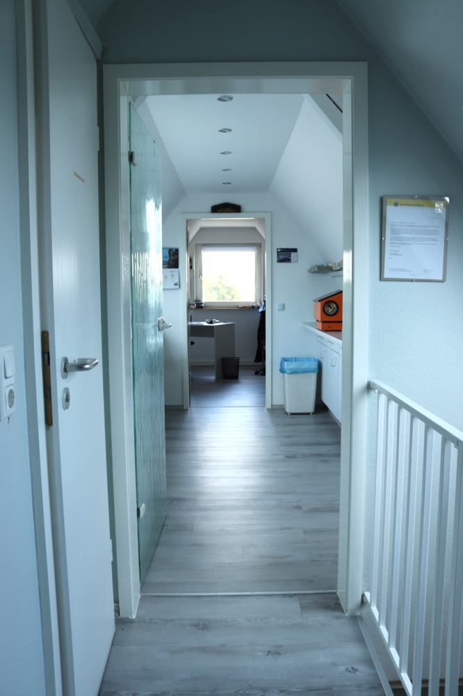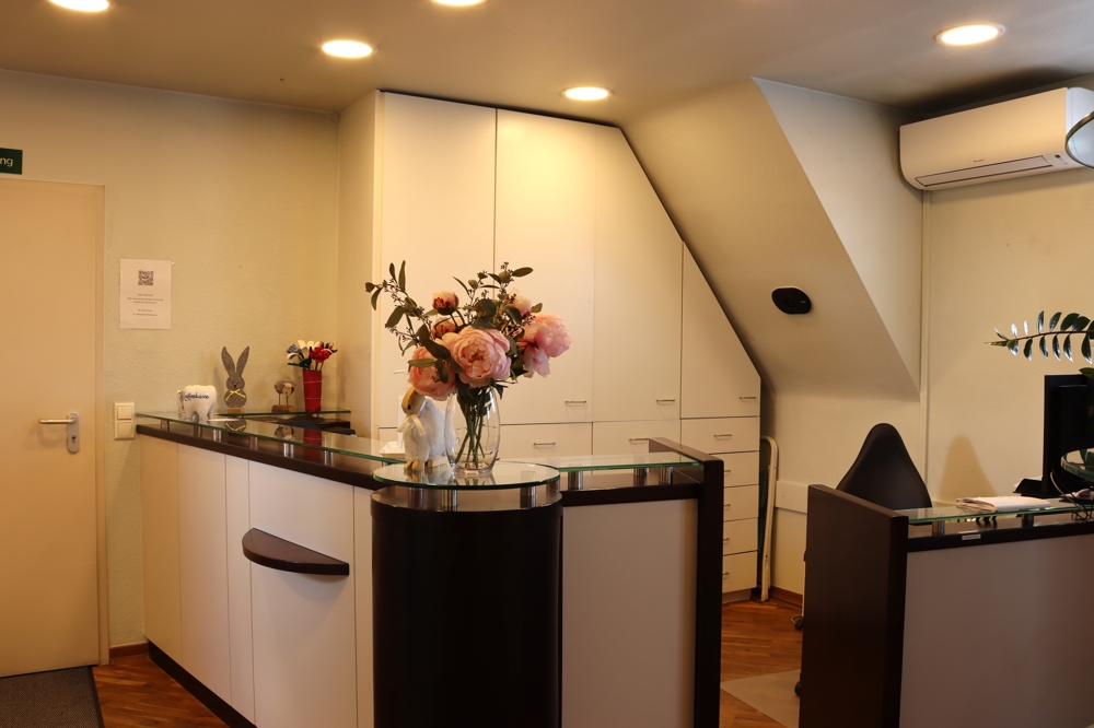 Bereits beim Betreten erreichen Sie über das helle Treppenhaus oder bequem mit dem hauseigenen Aufzug den einladenden Empfangsbereich. Dieser bietet reichlich Platz für Ihre individuelle Gestaltung und wird durch einen angrenzenden Wartebereich mit stilvoller Glasabtrennung ergänzt.