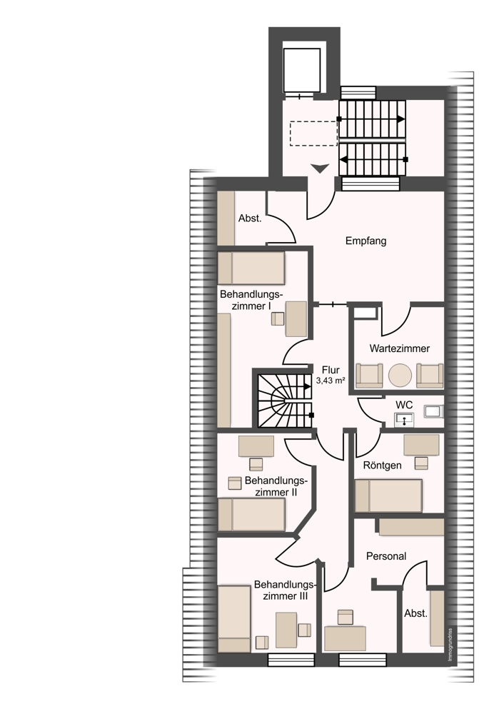 Über eine elegante Wendeltreppe gelangen Sie in das Obergeschoss der Einheit. Hier erwarten Sie zwei weitere lichtdurchflutete Zimmer, die flexibel genutzt werden können – ideal beispielsweise als zusätzliche Behandlungs- oder Büroräume. Auch auf dieser Ebene steht Ihnen ein separates WC zur Verfügung.