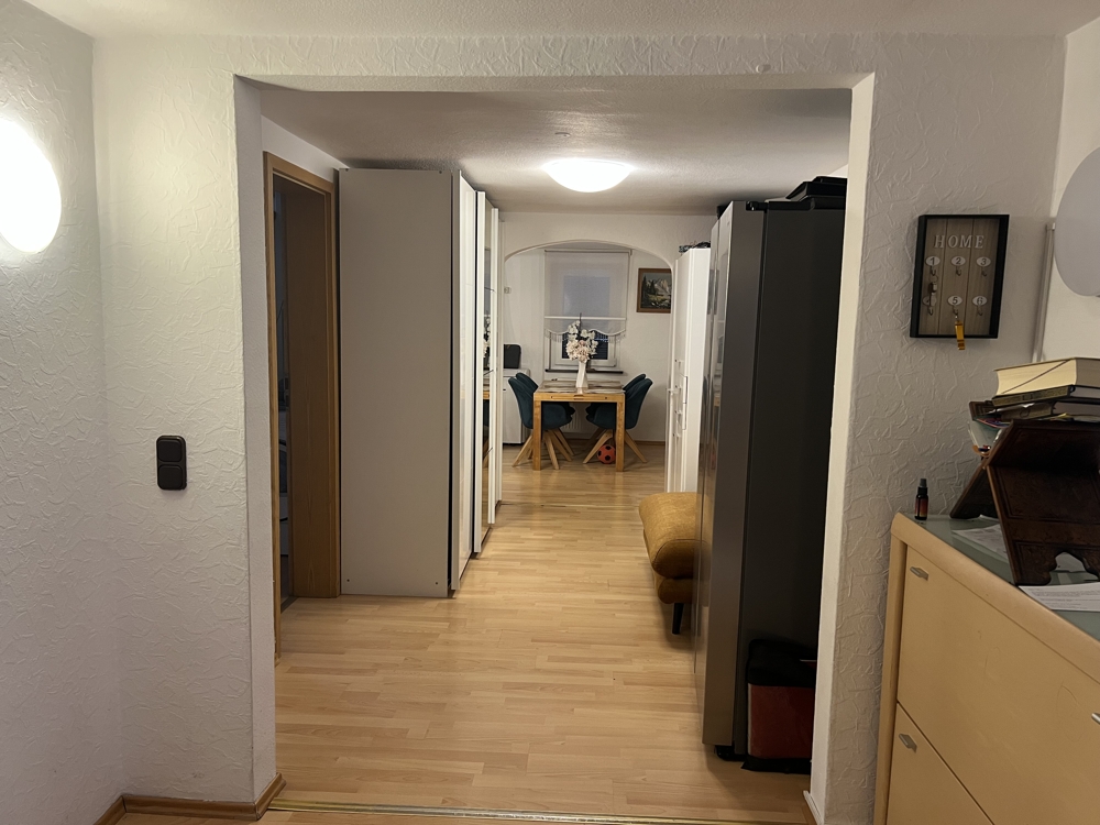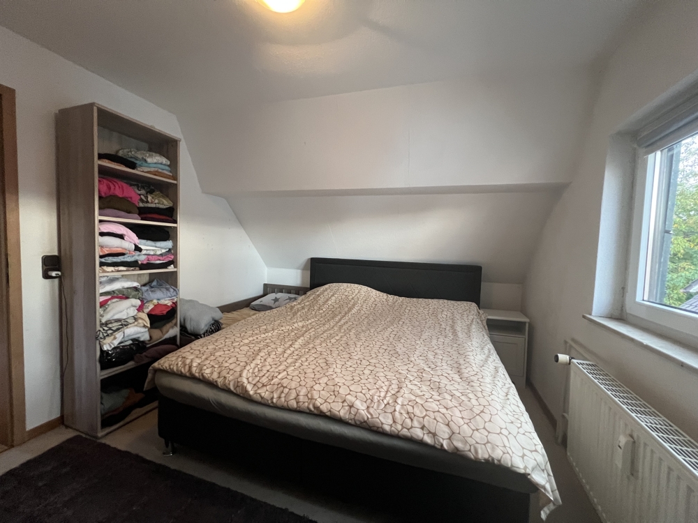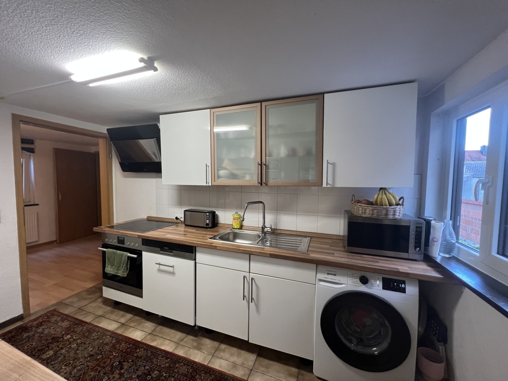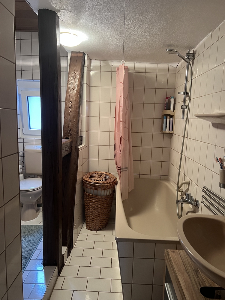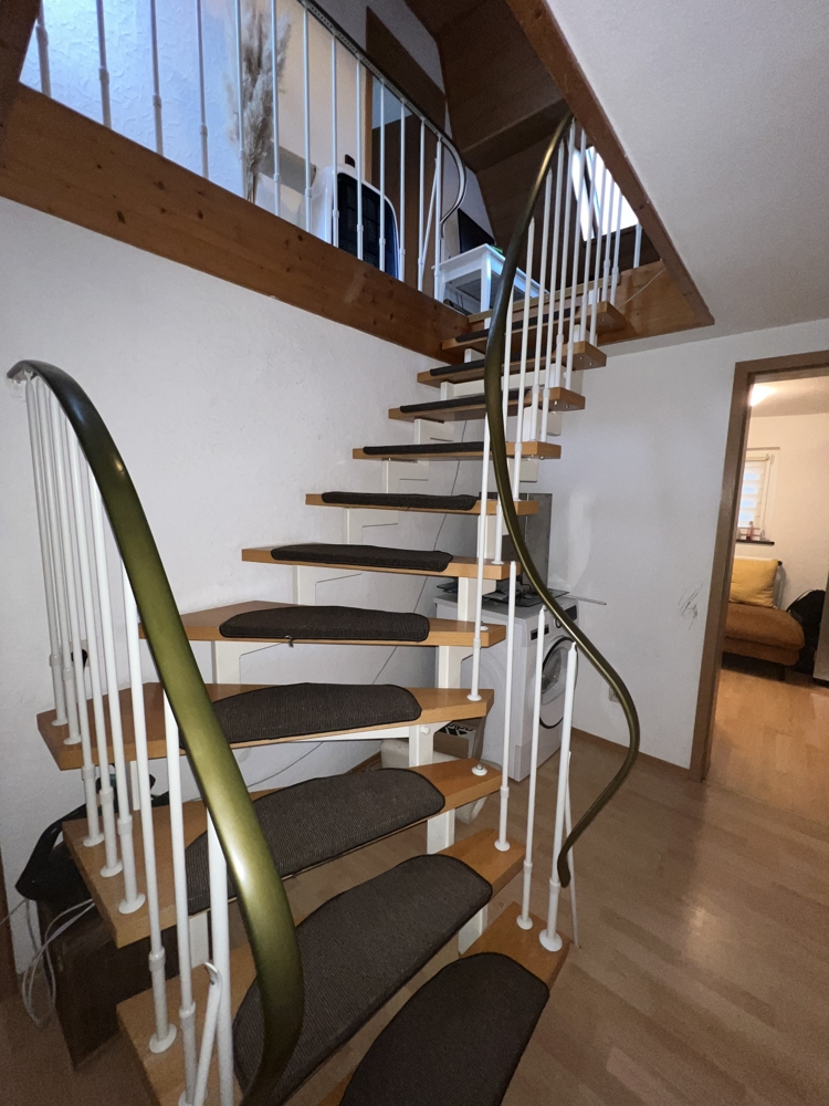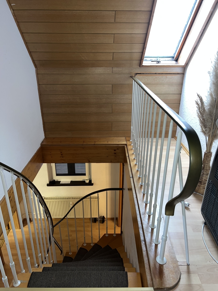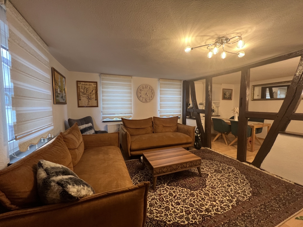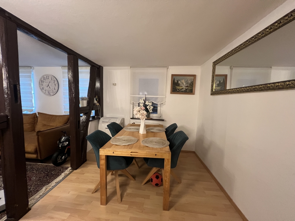 Ebenfalls im 1. Obergeschoss beginnt die gepflegte Maisonette-Wohnung mit insgesamt ca. 89m² Wohnfläche, die sich über zwei Ebenen erstreckt. Die erste Wohnebene mit ca. 58m² umfasst ein großzügiges Wohnzimmer mit angrenzendem Essbereich, eine separate Küche sowie ein helles Tageslichtbad mit Badewanne. Der sichtbare Holzbalkenbestand verleiht dem Wohnraum einen besonderen Charme und unterstreicht den historischen Charakter des Hauses. Über eine innenliegende Treppe gelangt man ins Dachgeschoss der Wohnung, das eine Fläche von ca. 31 m² umfasst. Hier befinden sich ein geräumiges Elternschlafzimmer, ein Kinderzimmer sowie eine kleine Abstellkammer, die zusätzlichen Stauraum bietet.