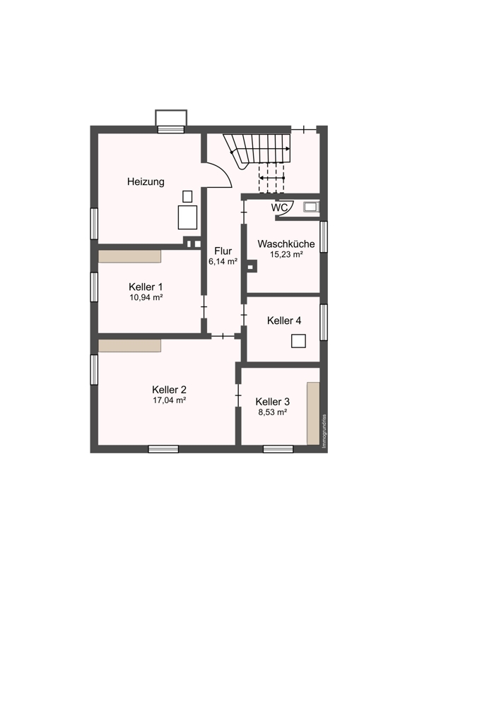 Im Keller befindet sich eine gemeinschaftlich genutzte Waschküche. Jede Wohnung verfügt zudem über einen eigenen Kellerraum zum Abstellen persönlicher Gegenstände.