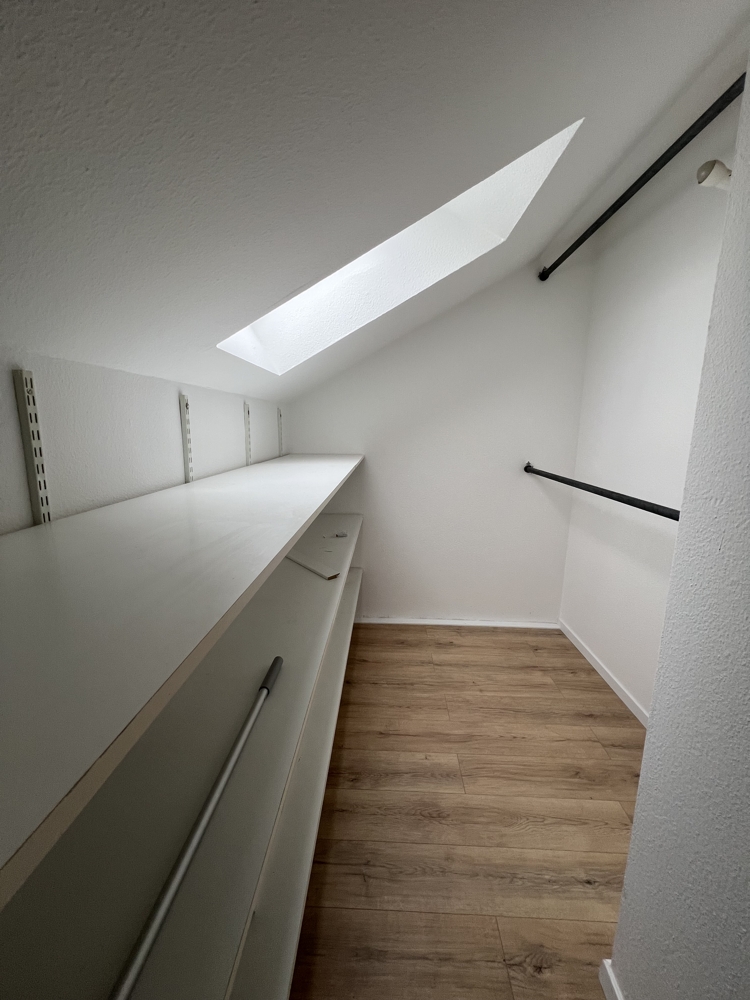 Über die interne Treppe erreichen Sie das Dachgeschoss, das mit einem großzügigen, hellen Badezimmer mit Tageslicht und moderner Duschkabine ausgestattet ist. Gegenüber befindet sich ein praktischer Ankleideraum, bereits mit Regalen und Kleiderstangen eingerichtet – hier findet alles seinen Platz. Ein großes Elternschlafzimmer bietet viel Raum für individuelle Einrichtungsideen, und das Durchgangszimmer kann ideal als Arbeitsbereich oder Homeoffice genutzt werden – perfekt für flexible Wohnbedürfnisse.