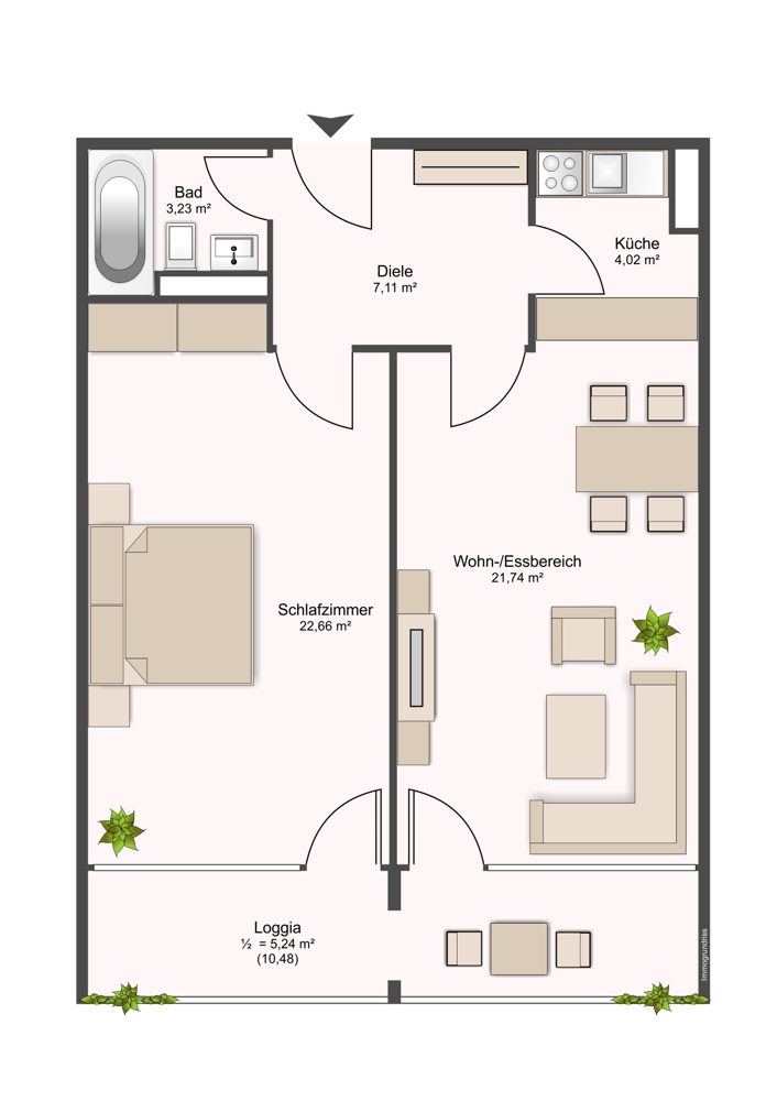 Mit einem der beiden Personen- und Lastenaufzüge gelangen Sie bequem zur Wohnung. Die Diele bildet das Herzstück der Wohnung und ermöglicht den Zugang zu allen weiteren Räumen: dem hellen Wohn- und Essbereich, der halboffenen Küche, dem Schlafzimmer, sowie dem Badezimmer.