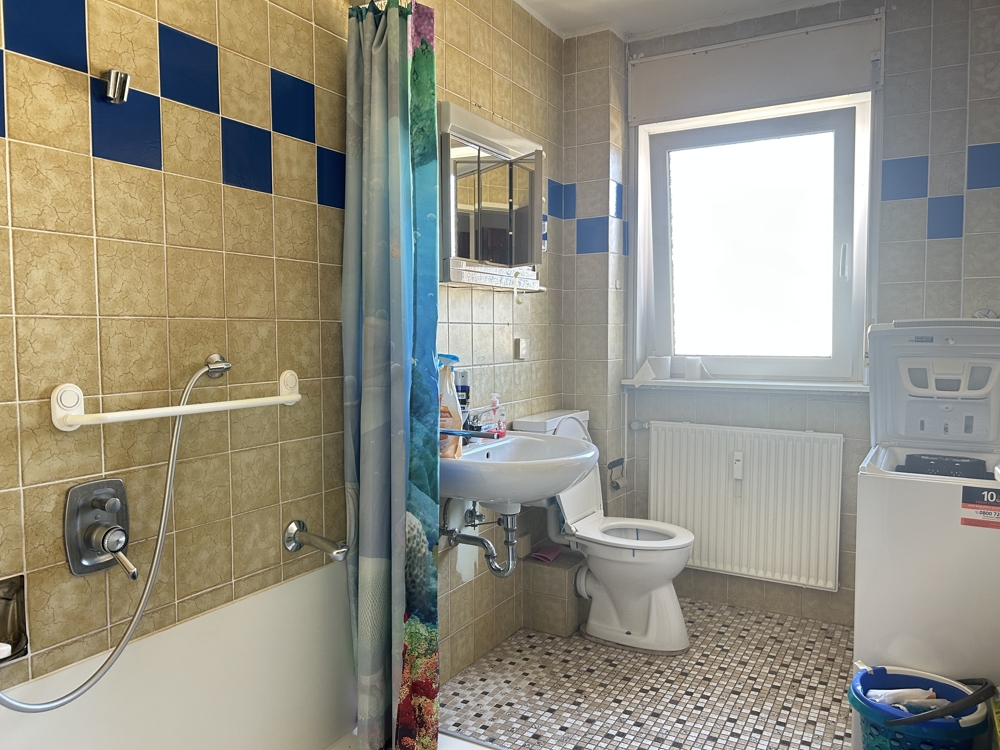 Direkt angrenzend liegt das hochwertig geflieste Tageslichtbad mit bodentiefer Dusche und praktischem Anschluss für die Waschmaschine.